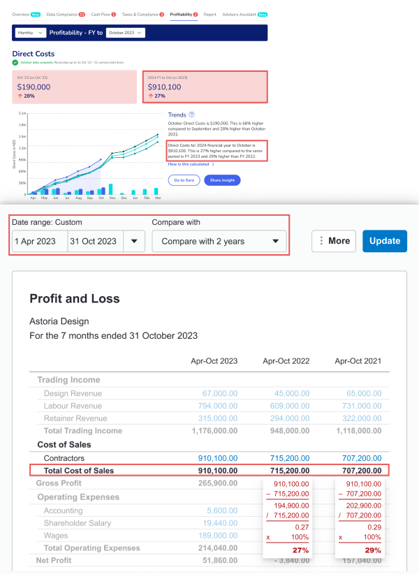 | % change vs same period 2 years ago | Pre-calculated for you based on Xero amounts. (Trends paragraph 2) |