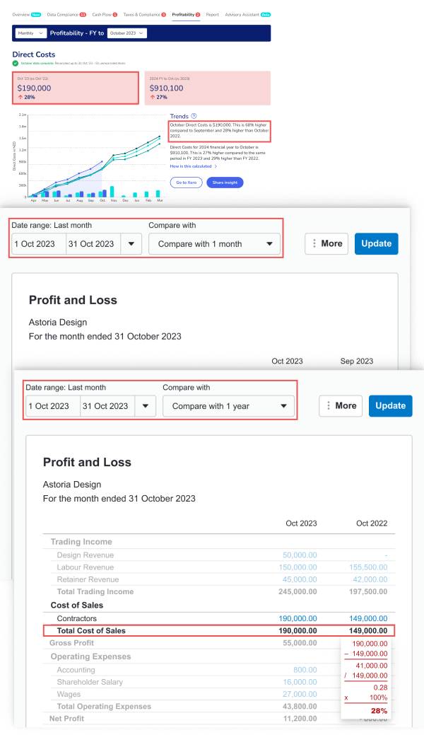 | % change vs same period last year | Pre-calculated for you based on Xero amounts. (Box 2 + Trends paragraph 2) |