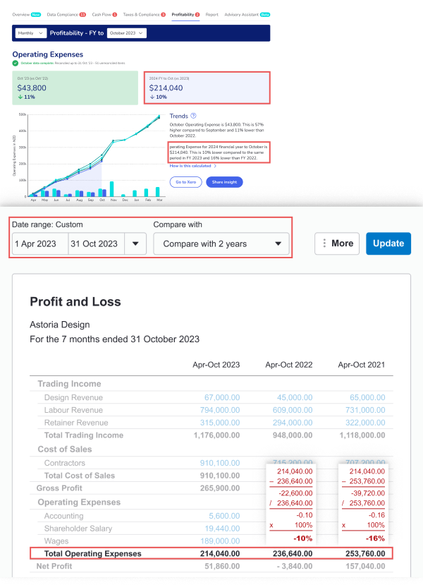 | % change vs same period 2 years ago | Pre-calculated for you based on Xero amounts. (Trends paragraph 2) |