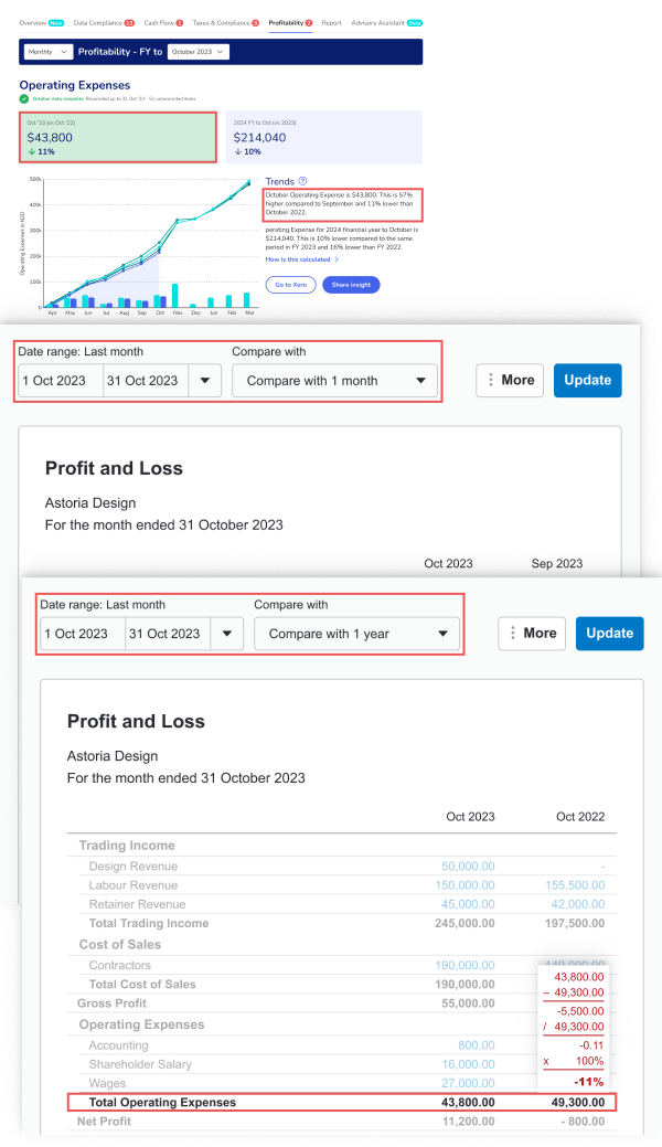 | % change vs same period last year | Pre-calculated for you based on Xero amounts. (Box 2 + Trends paragraph 2) |