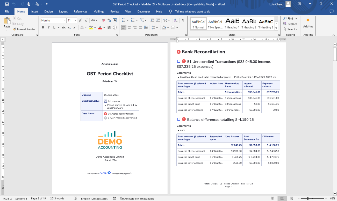- This allows you to download the selected checklist as a shareable Word document that includes all of the checks, alerts statuses, details, and comments.